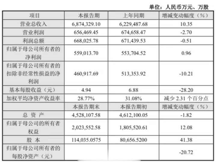 基本每股收益为4.94元,较上年同期下降28.20%。